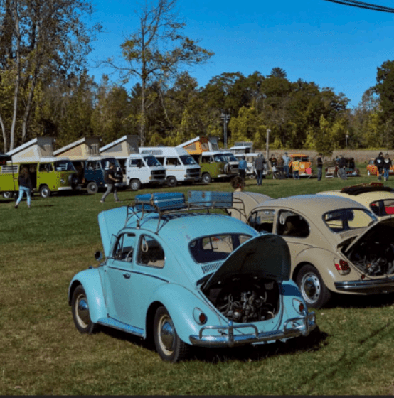 Just this past Saturday was the third annual WagenFest, held by an organization called WOLFSGART. A little meetup of a collection of some of the most easily identifiable vehicles ever made! On Saturday, October 12,I had just woken up and today was laundry day, but on the way to the laundromat, a sign caught my eye! That sign said, “Wagen-Fest 2024” with the date stated as today. While I’m not the hugest car guy, I still knew I had to check it out, since Hudson Crossing park is so close by. So on the way back into Schuylerville after laundry I walked down the little gulch, and headed into the event. At the opening there was a setup of small tables, with merchandise such as shirts, stickers, and keychains (I bought a sticker, pictured below), and beyond that were the main attractions! The most memorable of which being the classic vans, as well as the cute little beetles! Generally I would see maybe 1 VW van every few months, but here there were 10+, and that was only when I was there. Nearly all of the participants were friendly and excited to have someone to talk to about their beautiful vehicles, and towards the latter half of the event I was able to speak with the event organizers Anthony, Lasey, and Stella Fitzsimmons. Who brought their very own car to the event for display too, a 1961 all original pastel blue beetle, shown front and center below.